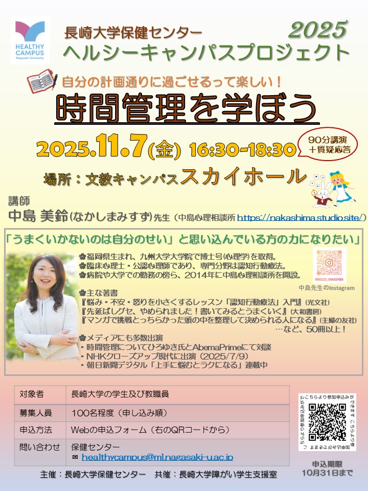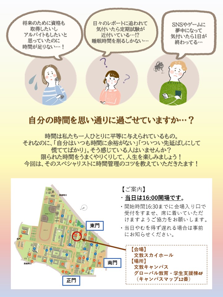 ヘルシーキャンパス・プロジェクトの一環として、「時間管理を学ぼう」をテーマに講演会を開催します。