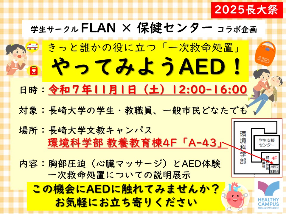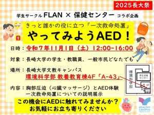 学生サークル「FLAN」の学生さん達と一緒に「AED体験会」を実施いたします!