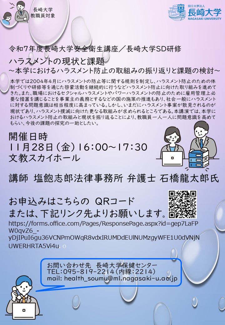 本講座は、長崎大学SD研修として開催いたしますので、教職員皆様方の多数のご参加をお待ちしております。