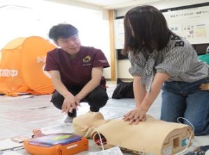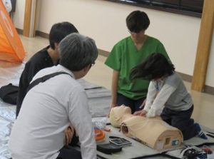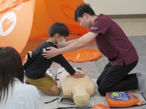 会場では来場いただいたグループ(サークル仲間、友人同士、ご家族等)ごとに、FLANの学生を中心に一次救命処置法を説明し、希望者の方全員に胸部圧迫法(心臓マッサージ)とAEDの使い方を実際に体験していただきました。